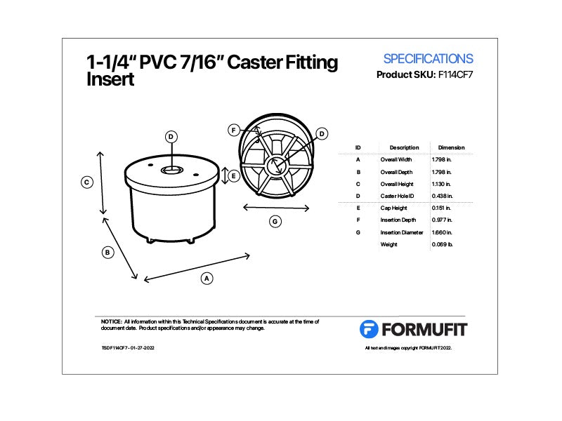 Make your structural PVC project mobile with the Formufit Caster Fitting Insert. This internal-fitting insert allows you to use threaded or 7/16 in. Dia stem casters inside 1-1/4 in. PVC fittings. Simply attach a threaded caster with a nut, or insert a stem caster into the cap and push the insert into a 1-1/4 in. PVC fitting. Total of 462 caps per box.