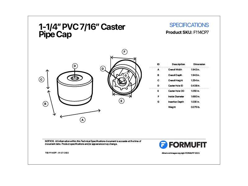 Make your structural PVC project mobile with the Formufit Caster Pipe Cap. This external-fitting end cap allows you to use threaded or 7/16 in. Dia stem casters on the end of PVC pipe segments. Simply attach a threaded caster with a nut, or insert a stem caster into the cap and slip over the end of 1-1/4 in. Sch. 40 PVC pipe. Total of 360 caps per box.